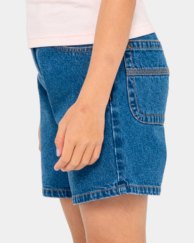 High Waisted Denim Short With Leather Trim. 100% Cotton Indigo Denim