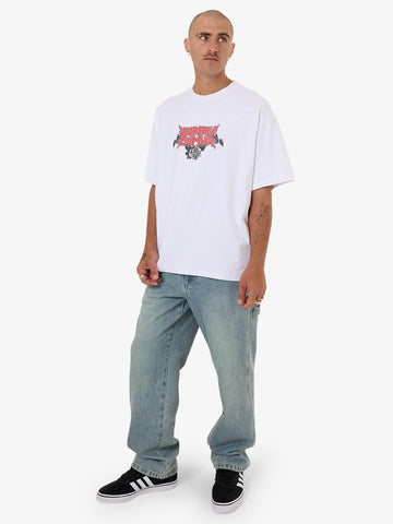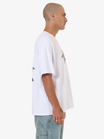 The Perch Oversized Tee in White goes full-force with bold back graphics, front type hits, and a heavyweight feel. Made from heavyweight cotton jersey, it features a boxy, oversized fit for superior mobility and a breathable, premium dry hand feel for all-day wear. This men's white tee is elevated with contrast artwork, giving the clean base a gritty, gothic edge.