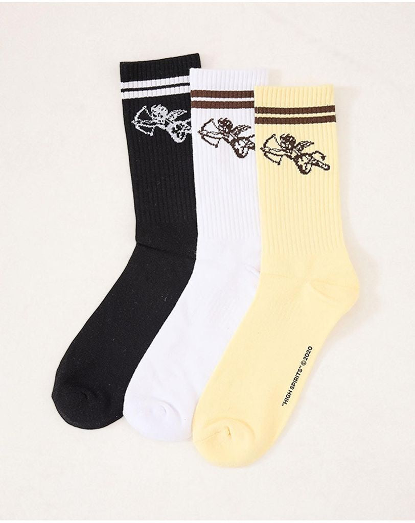 The Cherub Sock 3 Pack offers a versatile trio of lemon icing, black and white colourways. Crafted from a soft and stretchy blend of cotton, polyester, and elastane, these crew socks feature ribbed cuffs for a secure fit and cherub graphics for a distinctive finish. Designed in one size for everyday comfort and style.