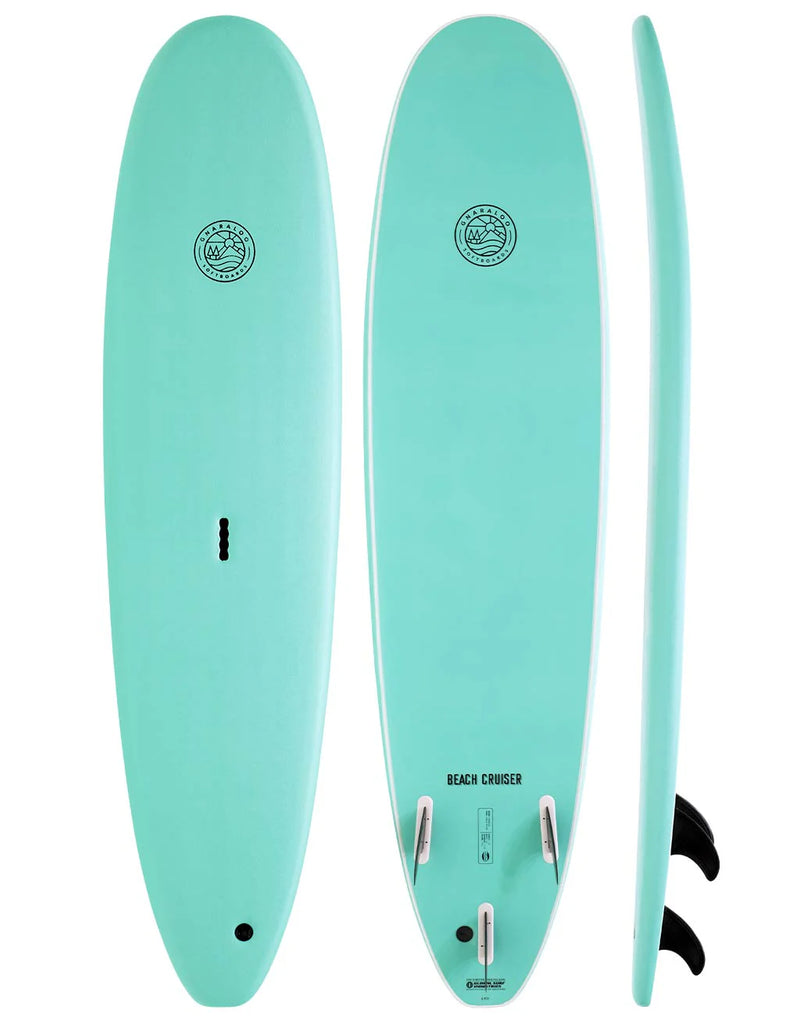 Gnaraloo Beach Cruiser surfboards provide the ultimate in fun and safety for beginner surfers. Theses boards are incredibly buoyant, stable, and easy to ride.read more >With an emphasis on safety and durability, the Beach Cruiser feature a thick Polyethylene deck and a soft slick skin on the bottom surface that’s tough enough to take a beating, yet is soft enough to keep beginners safe.The secret to the performance of these boards lies within the core. An embedded plywood stringer system maintains the integrity of the rocker while providing a stiff, stable platform. This lets you paddle onto waves with minimal effort and feel confident once you’re on your feet.These surfboards are designed to withstand the toughest of treatment, making them ideal for surf schools. The vacuum construction process eliminates hard or sharp surfaces, and prevents peeling or bubbling. A reinforced tail zone also provides added protection.Available in a variety of sizes from 9 foot right down to 6’0″. Each board comes fitted with a convenient carry handle and an easy-to-use fin system complete with flexible thruster fin set.Your initiation into the world of surfing starts with a Gnaraloo Beach Cruiser.