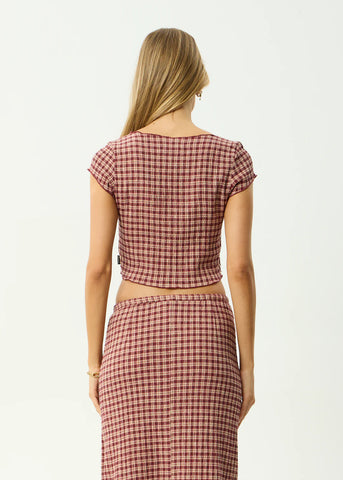The Capricorn collection is crafted in our in house designed yarn dyed woven check, made from lightweight, breathable hemp and tencel seersucker. Burgundy adds depth, beige keeps it grounded, with a subtle nod to vintage tailoring. This top is designed with a wide boat neckline, cropped length, cap sleeves, and baby lock edges for a clean finish