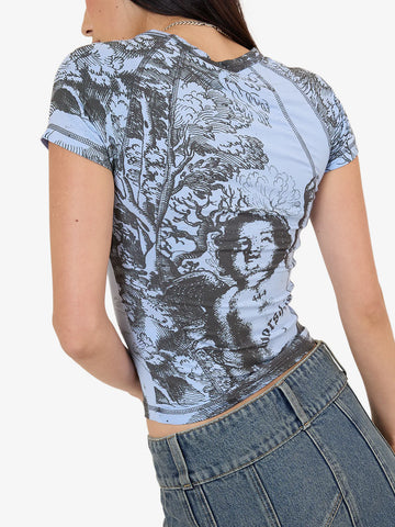 • The Not Your Angel Panelled Raglan Tee in Bell Air Blue delivers a standout street look with an all-over cherub graphic and second-skin, ultra-flattering fit. Made from a silky modal blend, itÕs lightweight, stretchy, and feels luxe on the skin. Contrast panelling and raglan sleeves give this women's streetwear tee an early-2000s edge, perfect for pairing with micro skirts or baggy denims.