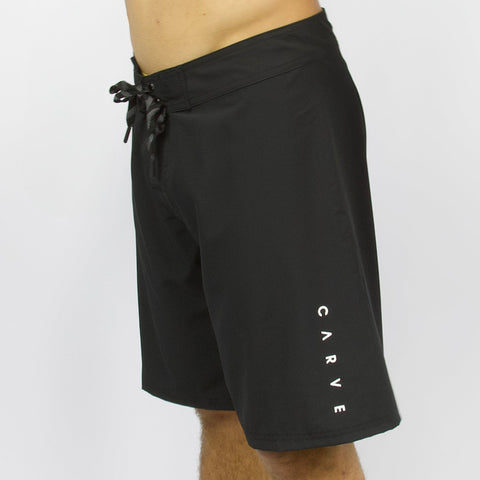 Men's basic board short with fitted waistline, front tabs and drawcord with elastane gusset fly, concealed zip pocket at back, CARVE logo print on left leg.