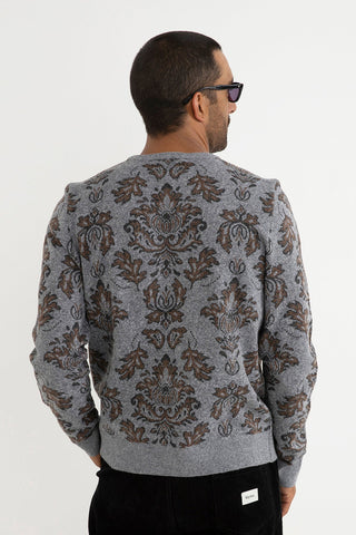 A textured take on classic knitwear, the Demask Knit in Heather Grey features a jacquard pattern with ribbed finishes for a structured fit. Soft and warm, it’s an easy layering piece for transitional styling.