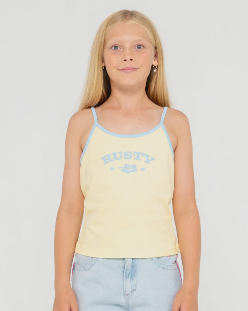 Fitted Cami Tank With Front Screen Print And Contrast Binding. 100% Cotton Midweight Jersey